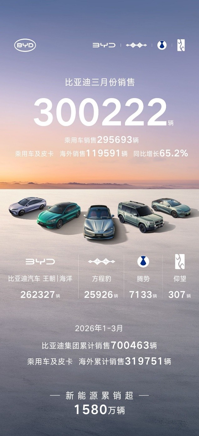 4 月 1 日,比亚迪发布 2026 年 3 月产销数据,单月总销量达300222 辆,强势突破 30 万辆大关,斩获中国车企销量冠军,并连续 58 个月蝉联中国新能源汽车销量冠军,持续稳固行业龙头地位。截至目前,比亚迪新能源汽车累计销量已超1580 万辆,一季度累计销售 700463 辆,以硬核数据印证技术与规模双重实力,用技术创新持续引领行业向上。