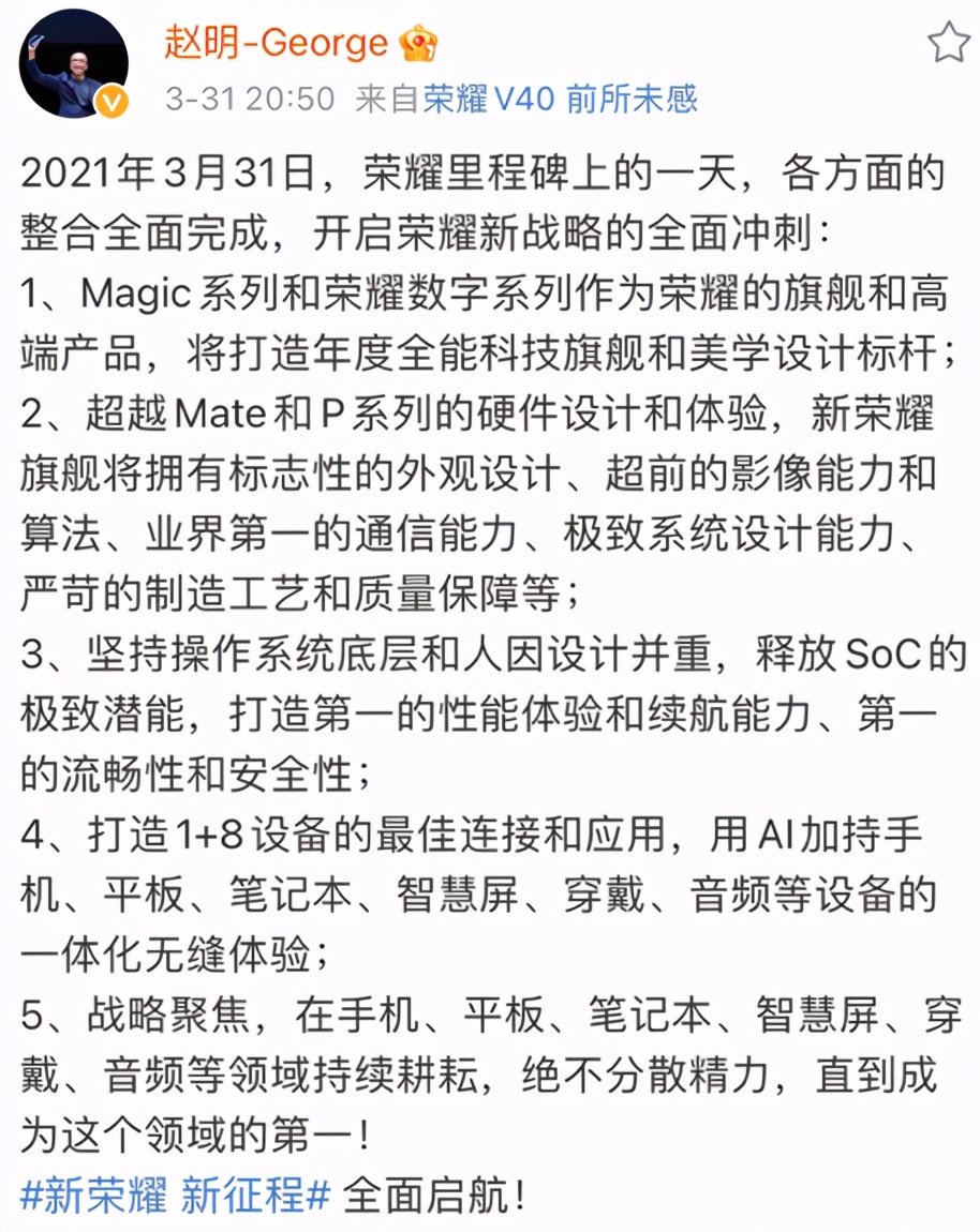 遥想当年,余承东大手一挥带领华为消费者业务进行改革,一步一个脚印地将华为手机带到今天的这个高度,而今天荣耀所经历的一切,和当年的华为又有一些相似,比如都公开立下了今后的目标,旗舰手机终究是比拼实力的舞台,在软硬件条件已经准备就绪的情况下,荣耀或许真的可以在高端市场接棒华为,而荣耀Magic也很有机会成为华为Mate50系列手机的真正“接棒者”。