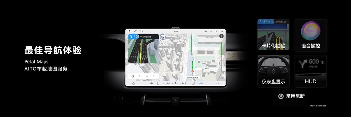 Petal Maps的设计符合人体工程学,为用户带来了诸如智慧分屏、多屏交互、光线感知、空调联动等人性化设计,简洁易用的交互界面更为贴近真实场景;拥有限速、拍照、路口放大图、实时路线等丰富的路网信息,支持多种方式查找地点、根据实时路况合理规划最优路线、复杂路口放大提示、3D导航等功能。有了智慧分屏的加持,用户可自定义多个App分屏显示,做到不同类型信息间的区隔,在使用娱乐应用时,地图也会自动切换为小卡片模式,做到导航娱乐两不误;此外,多屏交互体验还支持在中控屏、仪表盘、HUD抬头显示等不同区域上显示导航信息,即便在行驶过程中接听来电,也不会影响导航进程,让驾驶更安全;而有了深色模式的加入,车机系统界面就会依据外界环境光线的变化而自动切换深色/浅色,