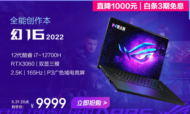 高端游戏本ROG的多款爆款产品同样福利引爆!满血3060信仰游戏本ROG魔霸新锐2022到手仅需8999元;全能本旗舰ROG幻16到手9999元,还有配置满血RTX 3060+12代酷睿i7的ROG枪神6,新配置到手仅需10999元,万元档最香高端游戏本,高阶玩家绝对不容错过!