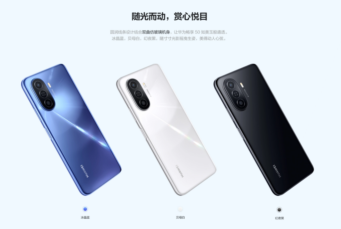 在这个看脸的世界,选手机自然也要考虑外观设计。华为畅享50系列的设计也非常大气,具备百搭的能力。华为畅享50提供贝母白、冰晶蓝、幻夜黑三种配色。华为畅享50 Pro后置摄像头模组以华为星环设计为蓝本,带来星耀环设计,呈现极致对称美学,拥有星海蓝、翡冷翠、雪域白和幻夜黑四款配色。