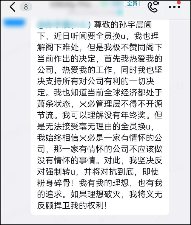 有疑似火必的员工在工作群激动发言:“我也知道当前全球经济都处于萧条状态,火必管理层不得不开源节流。我可以理解没有年终奖。但是无法接受毫无理由的全员换U……我坚决反对强制转U,并将对抗到底……”