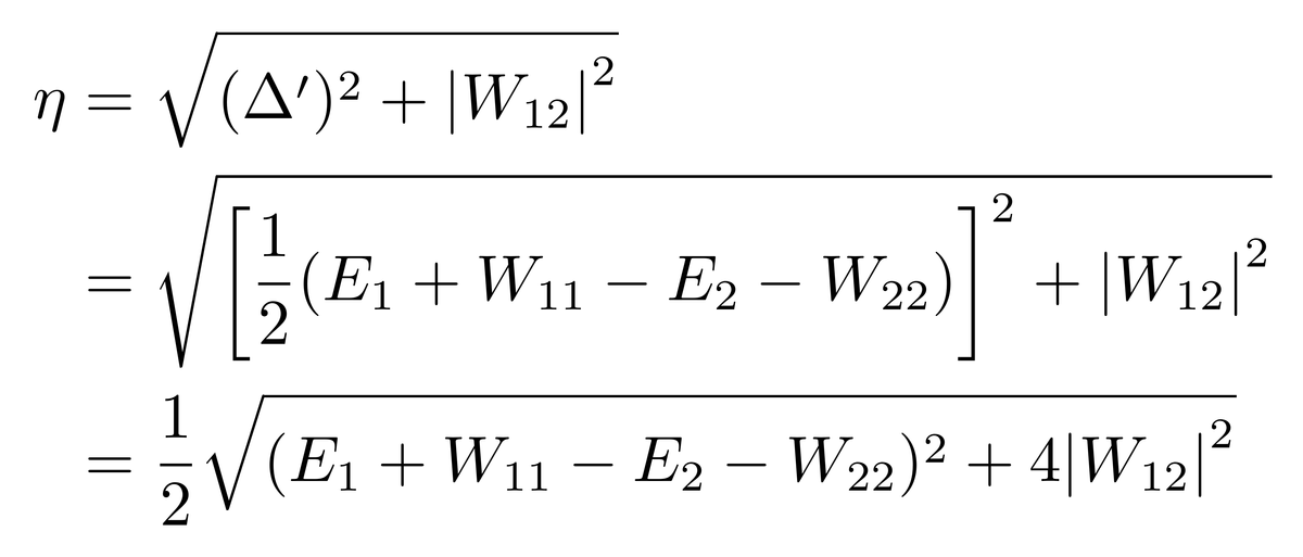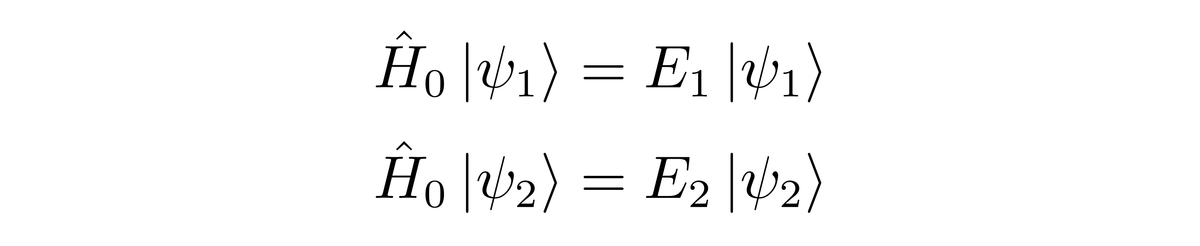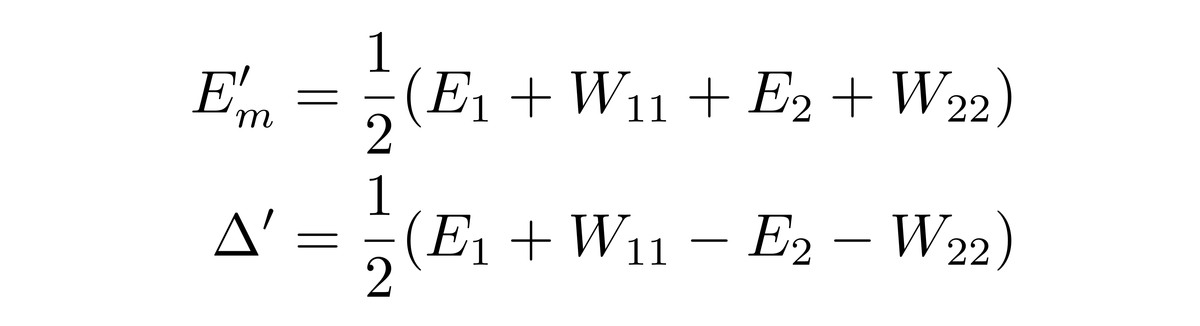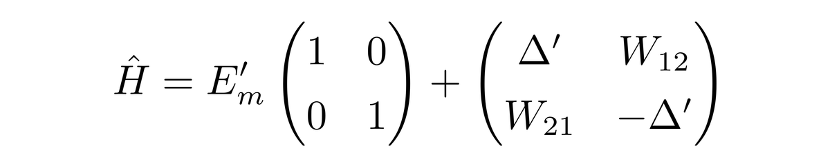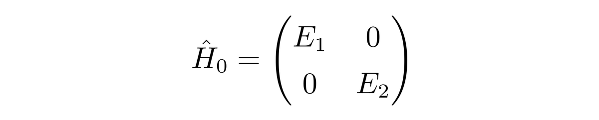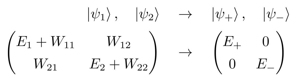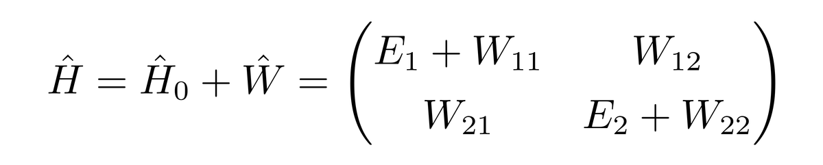 由于|ψ1〉与|ψ2〉被假设成已知的,因此可以使用它们作为基矢。H0的矩阵形式在前面介绍了,现在还需要知道W的矩阵形式。由于目前的系统的态空间是二维的,所以W|ψ1〉可以表示成|ψ1〉与|ψ2〉的线性组合,W|ψ2〉也可以表示成|ψ1〉与|ψ2〉的线性组合,所以有
