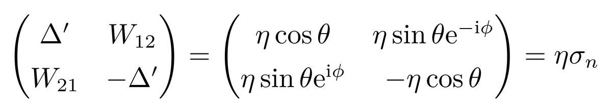此时[H,σ_z]≠0,所以H在基矢|±〉下不是对角化的。不过由于在之前的物理课中已经求解了σ_n的本征态,由此容易得到哈密顿算符的本征态表达式。