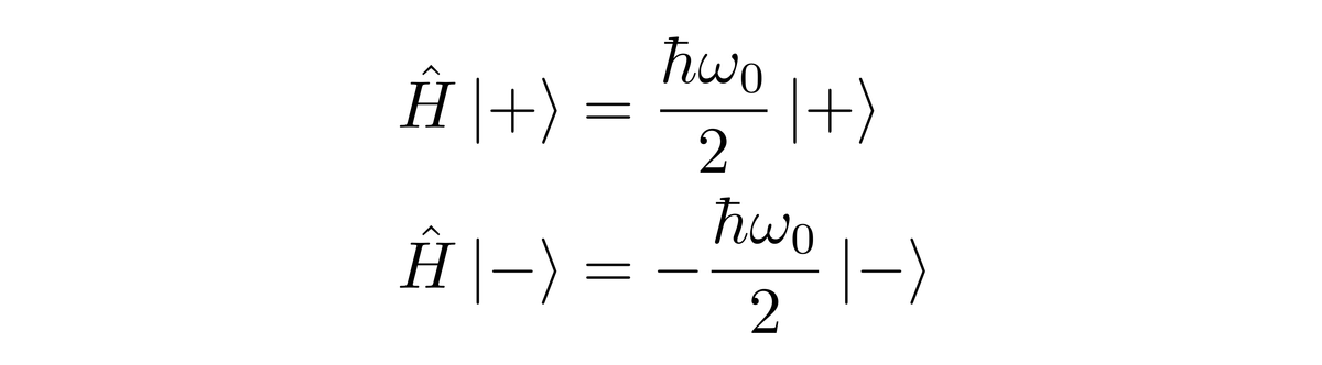 其中ω0是与拉莫尔进动有关的角频率,具体定义可参考上一次直播课,算符σ_z正比于自旋算符的z分量Sz,它在|±〉为基矢的情况下的矩阵形式就是z方向的泡利矩阵。此时的能量本征态为|±〉,满足