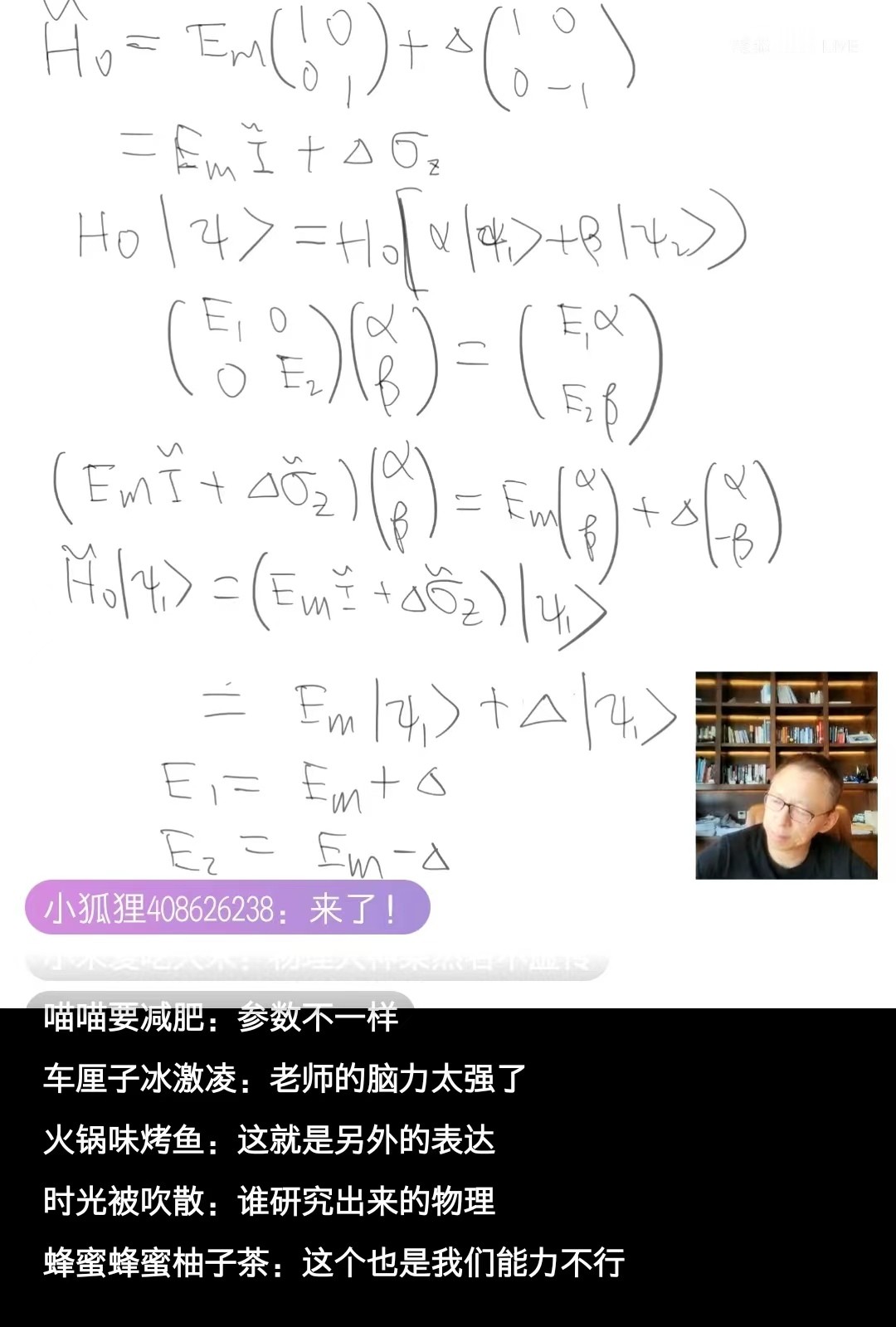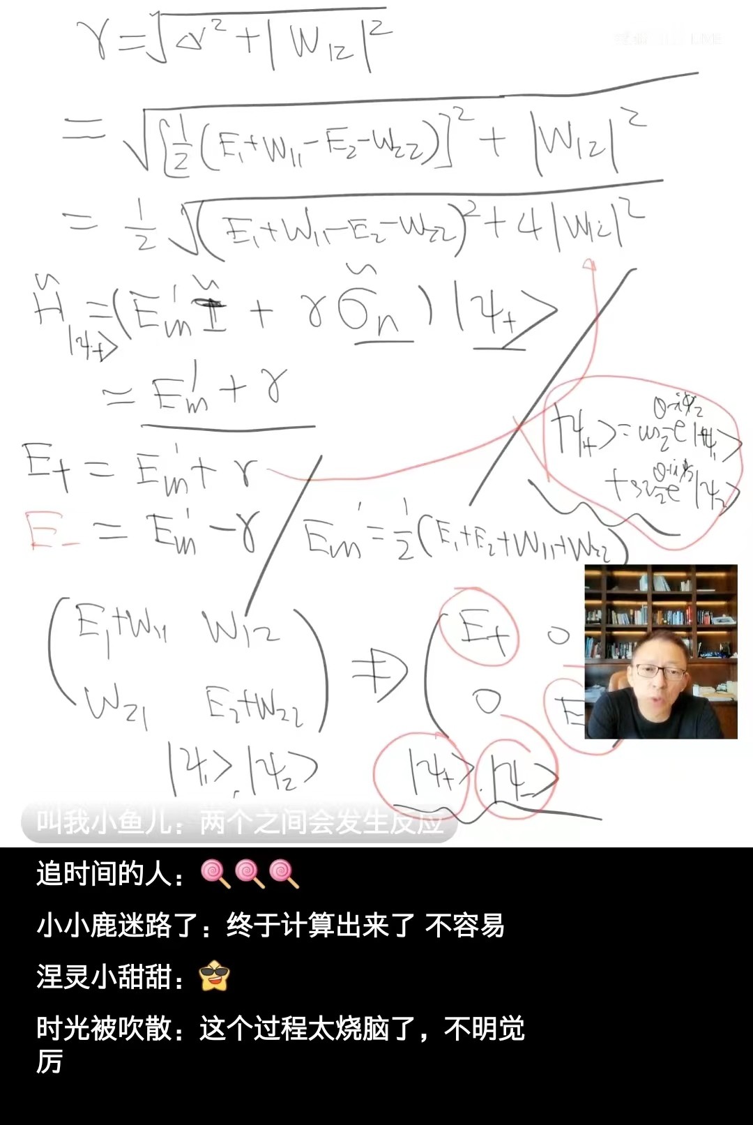 张朝阳强调说,从|ψ1〉、|ψ2〉出发得到|ψ+〉、|ψ-〉,本质上就是将H对角化了: