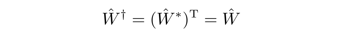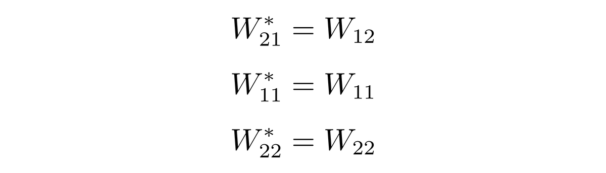 换言之W的矩阵表示中,两个对角元都是实数,而两个非对角元互为共轭复数。