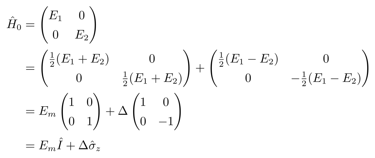 其中I是单位矩阵对应的算符,也就是恒等算符。可见,在能量本征态作为基矢的情况下,哈密顿算符可以写成单位矩阵与z方向的泡利矩阵的线性组合。