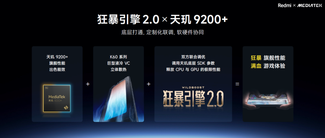 为充分释放天玑9200+旗舰性能, 双方团队早在1年前就定下了底层打通的协同共创开发模式,并将天玑9200+的底层接口资源开放给了Redmi 研发团队。借助天玑开放的接口,双方在软硬件技术上实现了高度的开放与协同,使得狂暴引擎2.0可以深度调用天玑9200+旗舰芯的底层SDK参数,充分释放CPU、GPU的极限性能。通过软硬件协同合作,狂暴引擎2.0在天玑9200+上实现了功能的全面落地,助力Redmi K60至尊版的性能和游戏表现更为强悍。