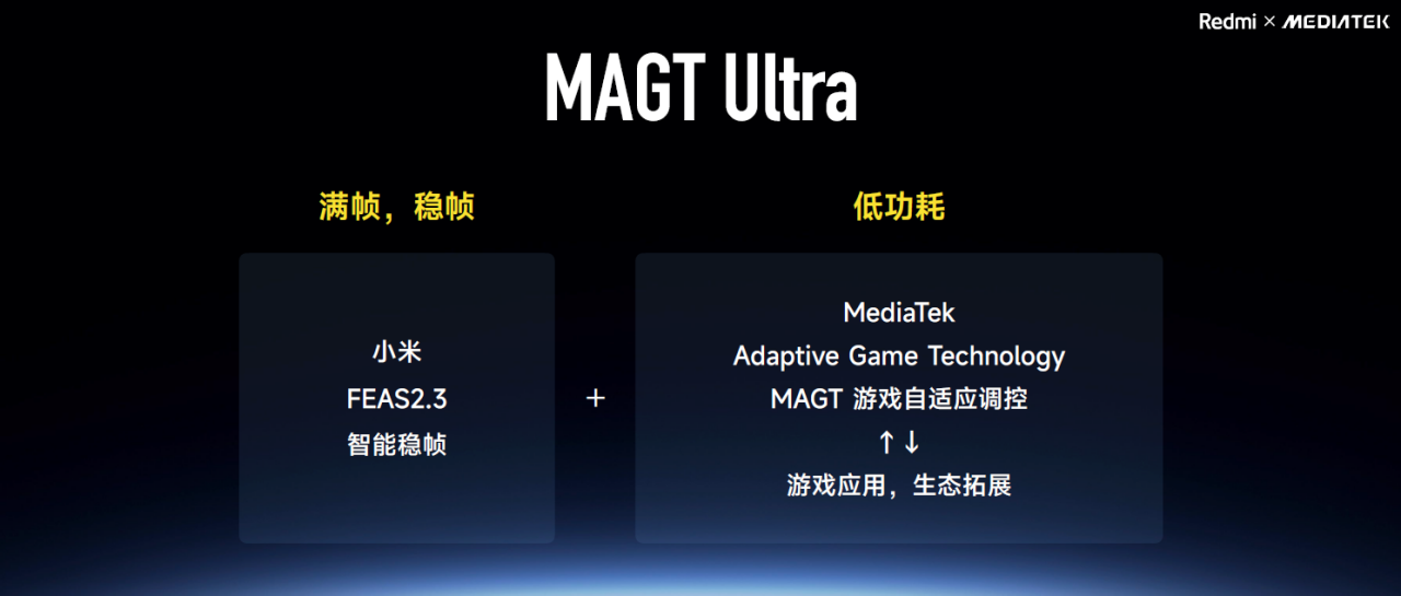 为了给玩家们带来真正的满血游戏体验,联发科 与 Redmi 此次在技术层面实现了深度融合,将联发科游戏自适应调控技术(MediaTek Adaptive Game Technology,MAGT)与小米FEAS 2.3 智能稳帧技术相结合,打造出MAGT Ultra这一游戏黑科技。有效提高游戏帧率的同时,显著节省功耗,为玩家带来更高帧率、持久稳帧、不发烫的长续航游戏体验。