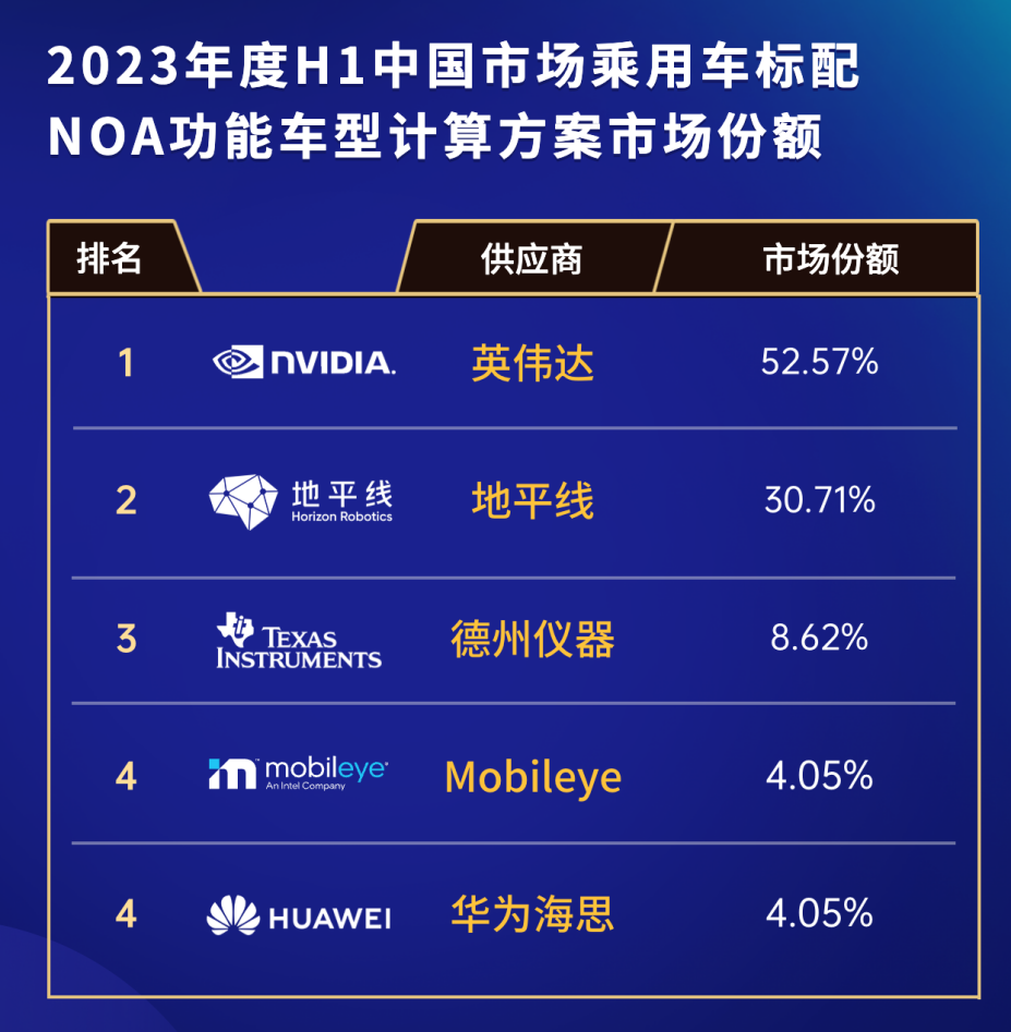 高工智能汽车研究院2023年H1 NOA计算方案市场份额榜单