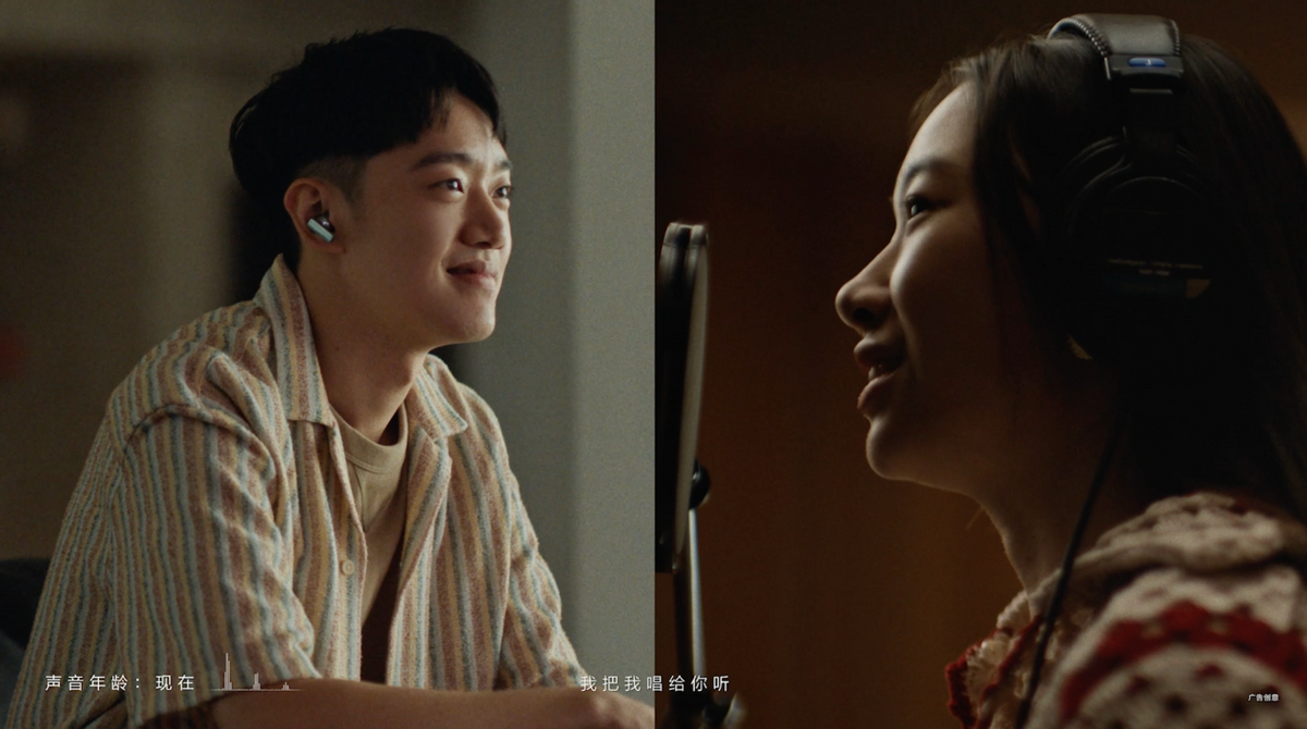广告片联合中央音乐学院音乐人工智能系的教授,邀请了三对不同年龄段的夫妻,利用软件还原了他们小时候的歌声,并通过华为FreeBuds Pro 3超CD级无损音质播放给他们的另一半聆听,让声音中每一个动人的细节都能通过耳机的无损音质得以完美还原。