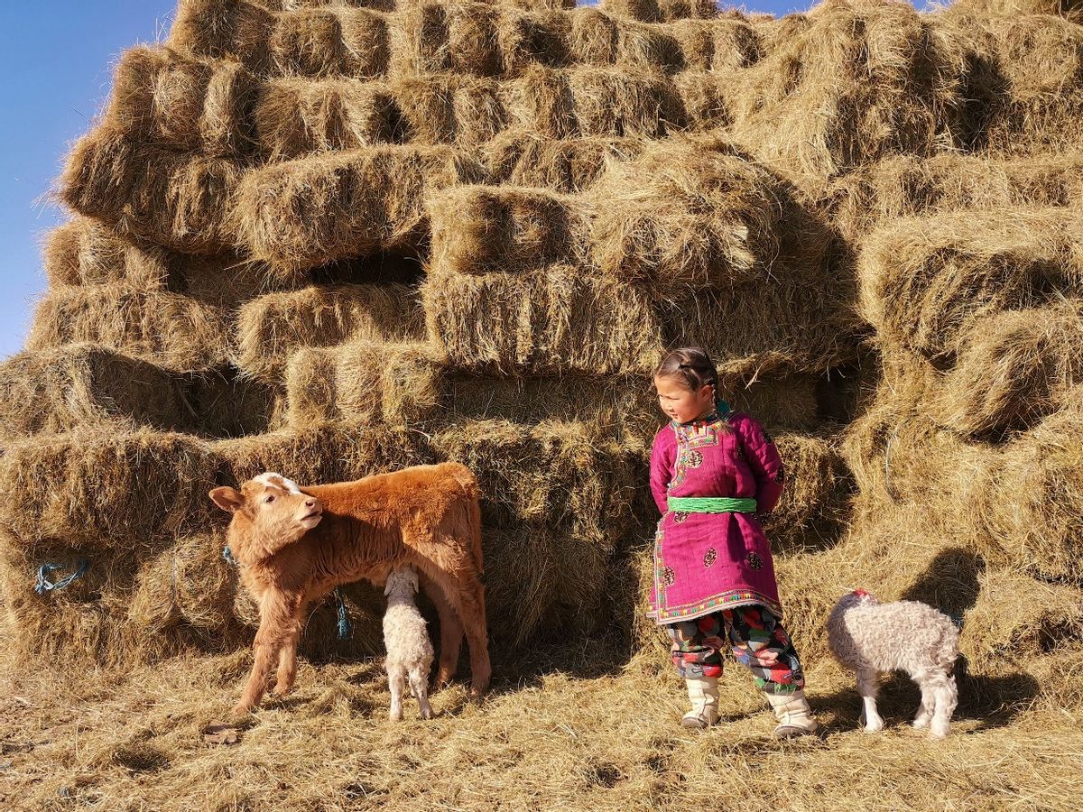 下面这件作品拍摄于三月乌珠穆沁草原的接羔季,在小女孩放牧的时候,一只小羊羔错把小牛犊当成了妈妈,另一只小羊羔则躲在小女孩身后的阴影下,不知应该作何反应的小牛犊只得看向小女孩,还原出一幅草原童年天真烂漫的快乐时光。