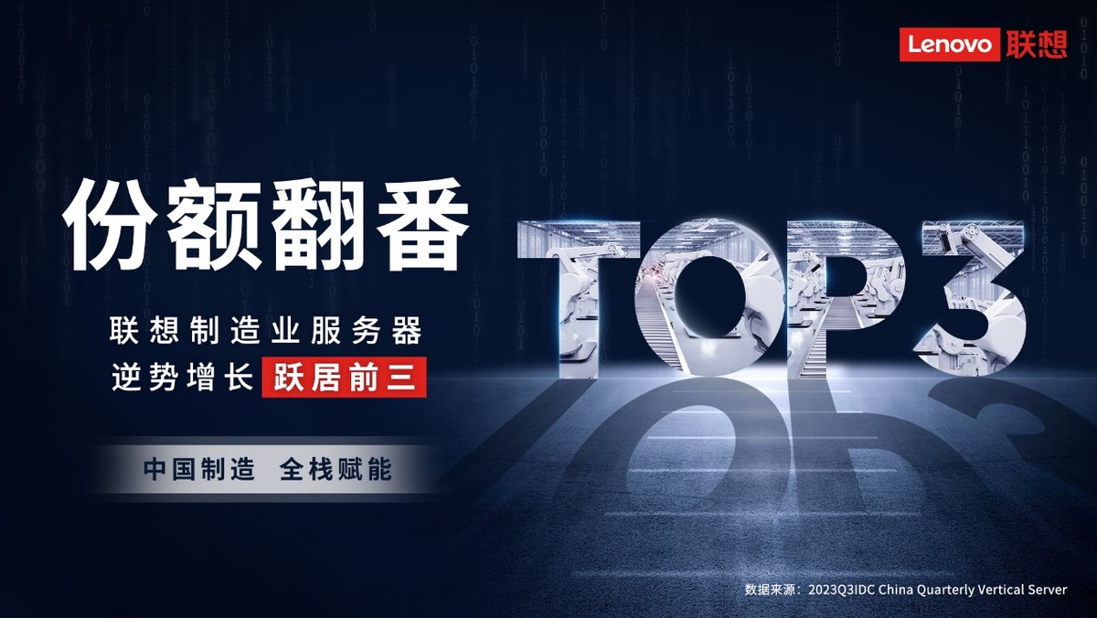 近日,IDC最新公布2023年第三季度中国制造业服务器市场规模数据。数据显示,联想制造业服务器市场份额实现翻番,同比增速103%,远超行业平均值增长,再创历史新高,市占率跃居前三。