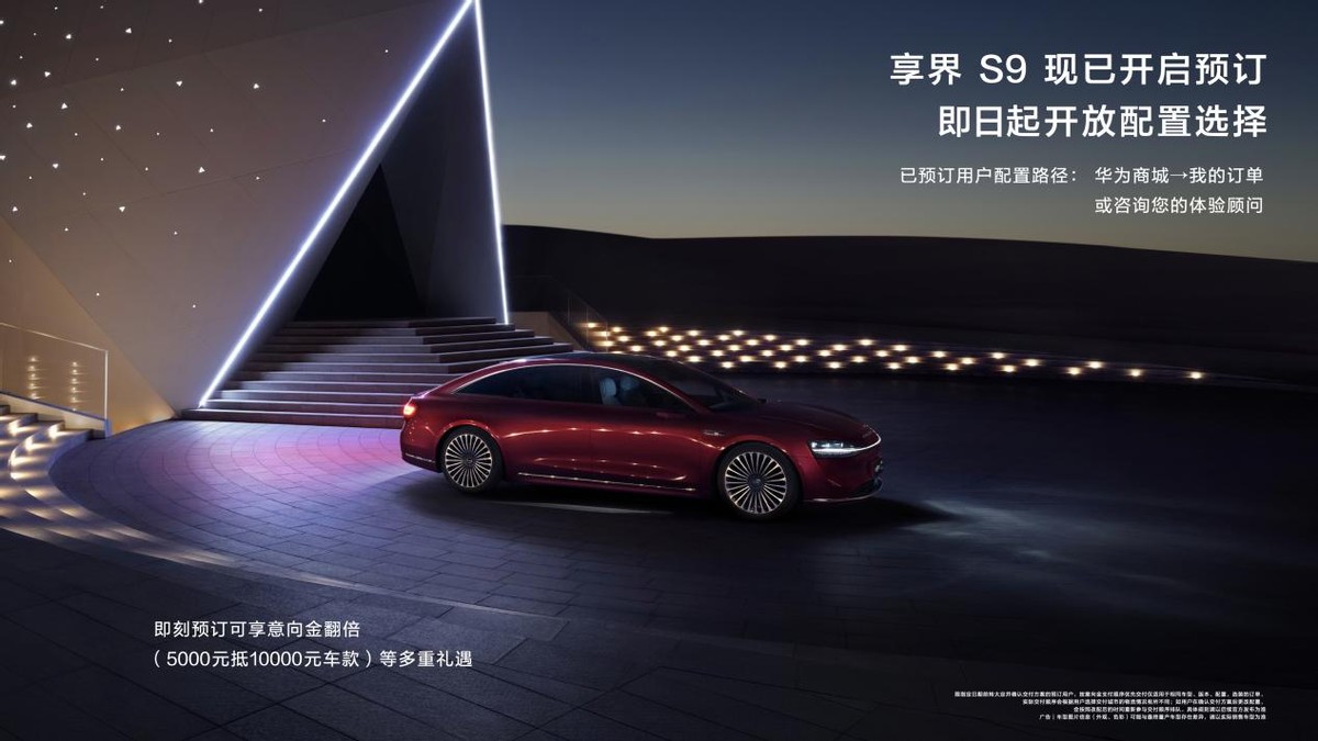 享界S9在7月8日起正式开放预订和配置选择。用户即刻预订,可享意向金翻倍(5000元抵10000元车款)、按意向金支付顺序优先交付等多重礼遇。同时,用户可根据个人喜好选择车型版本、外观/内饰颜色、轮毂及零重力座椅套装、流媒体外后视镜、智能激光投影系统等丰富配置,打造专属的豪华座驾。