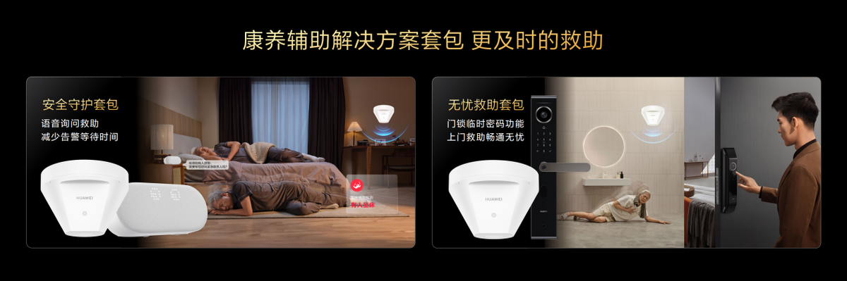 无忧救助包有AI辅助康养传感器Wi-Fi版 + 华为智能门锁系列,主打的是出现紧急状况,比如摔倒时,门锁可以生成临时密码,如果监护人没法立即赶回,可以将临时密码给邻居,实现快速救助。