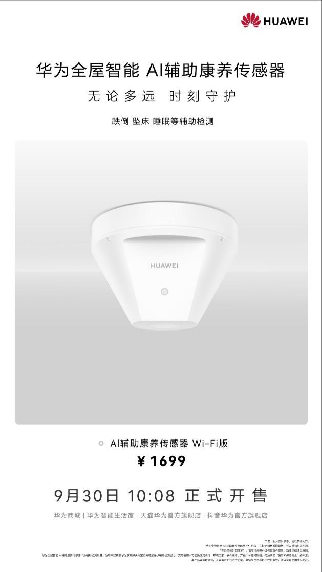当前华为AI辅助康养传感器 Wi-Fi版已于9月30日正式开售。AI辅助康养传感器Wi-Fi版定价1699元人民币(含首次上门安装服务);无忧救助包售价3098元起,安全守护包售价1898元,具体信息以官方发布为准。以上产品及套包,用户均可在华为商城、华为天猫官方旗舰店、华为抖音官方旗舰店、华为智能生活馆购买。