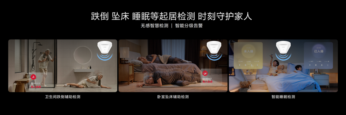 除了跌倒检测外,华为全屋智能AI辅助康养传感器Wi-Fi版还支持卧室的睡眠检测,精确了解老人家的睡眠健康,还可以联动中控屏智能调节房间的灯光、温度等睡眠环境。需要起夜时,可利用智能起夜检测自动打开夜灯。同理,卫生间也可以在有人进入时打开灯光。此外,无论是卧室还是卫生间,华为全屋智能AI辅助康养传感器Wi-Fi版都可以提供滞留、卧床、起夜过久检测的功能。