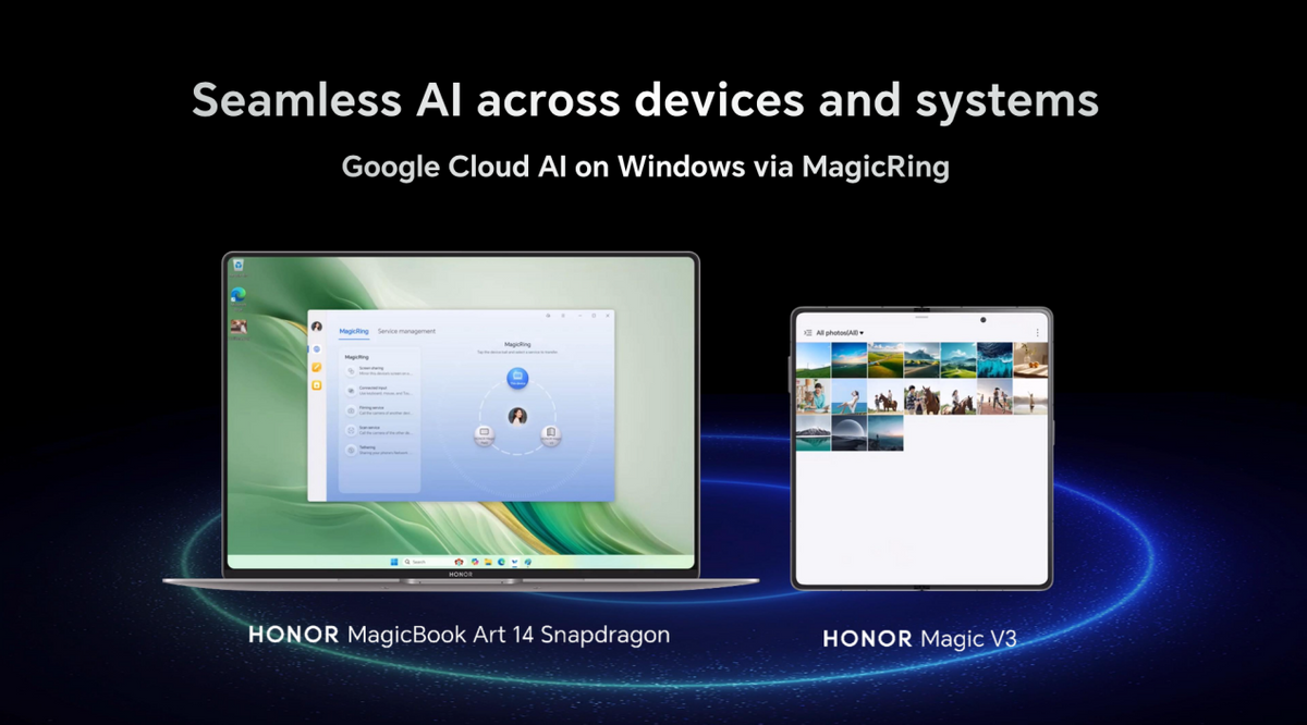 在智慧互联方面,荣耀以AI驱动的MagicRing信任环技术实现了跨系统、跨设备的无缝连接和数据共享,为用户打造“以人为中心”的全场景智慧体验。例如,荣耀笔记本电脑可以借助荣耀手机的AI能力,实现AI反诈、AI消除等创新体验。而荣耀和高通双方探索之下促成的Snapdragon Seamless跨平台技术,更进一步提升了互联体验的流畅性和稳定性,为构建更加开放和高效的生态奠定了基础。