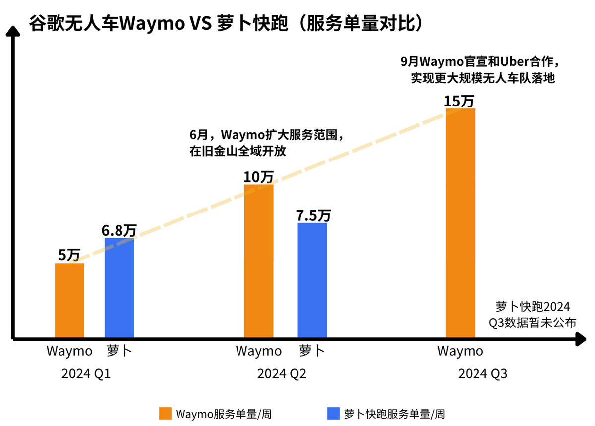 随着近期旧金山全域的无人驾驶的开放、无人车数量的激增和覆盖用户的增加,Waymo每周单量在8月反超中国最大的自动驾驶出行平台萝卜快跑后,其每周单量已经达到萝卜快跑的两倍。公开数据显示,萝卜快跑目前服务车辆仅为400余辆,今年二季度内提供的出行服务约89.9万次,平均每周提供出行服务7.5万次,同比增长26%。截至今年7月底,萝卜快跑已累计完成700万次安全出行服务。