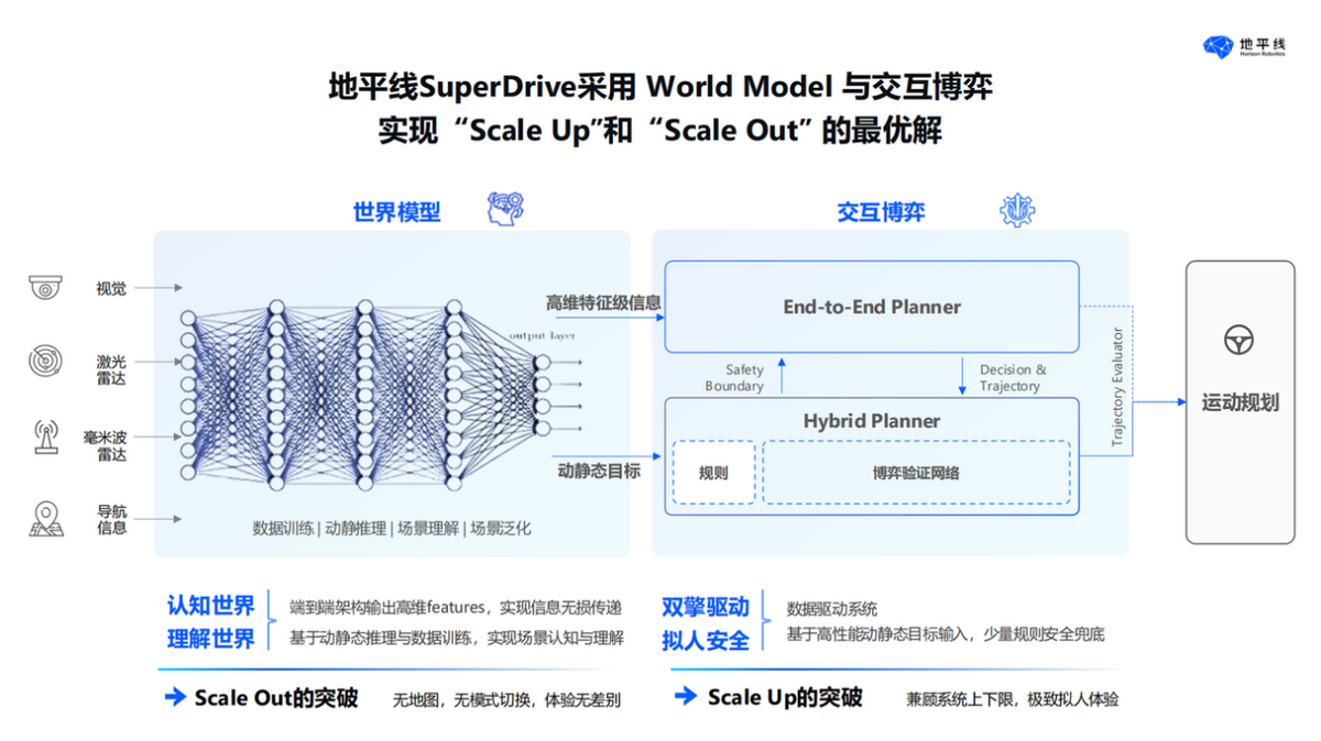 通过应用面向量产的端到端World Model以及交互博弈算法,地平线构建了全新的高阶智驾技术方案——Horizon SuperDrive™全场景智能驾驶解决方案,同时突破性能提升与场景泛化难题,打造出“Scale Up”和“Scale Out”的最优解。在性能提升与场景泛化的双重驱动下,地平线HSD将不仅仅是一个冰冷的机器,而是一个能够真正理解用户需求、预测用户意图、提供个性化服务的智能伙伴。