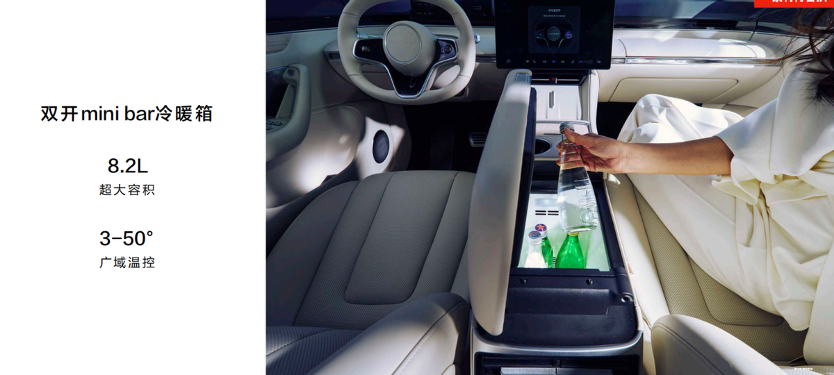 至于舒适性配置方面,智界R7也是十分丰富,比如当下流行的mini bar冷暖箱、66W无线充电以及后排支持通风、加热、按摩等。