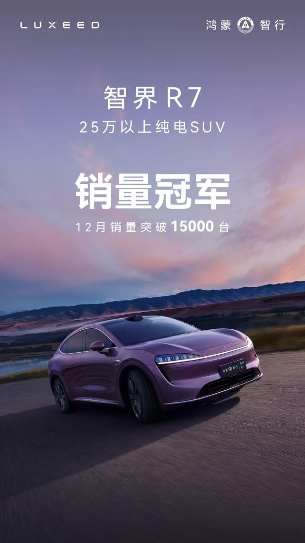 2025开年新能源市场便火药味十足,前不久刚宣布突破4.2万辆的智界R7,又再一次刷新了自己的热销纪录。鸿蒙智行官微发布的销量战报显示,智界R7在刚刚过去的12月份中销量突破15000台,一举拿下25万元以上纯电SUV销冠,对于一款主销车型在30万元的纯电SUV而言实属不易,正式向行业标杆特斯拉Model Y下达战书。