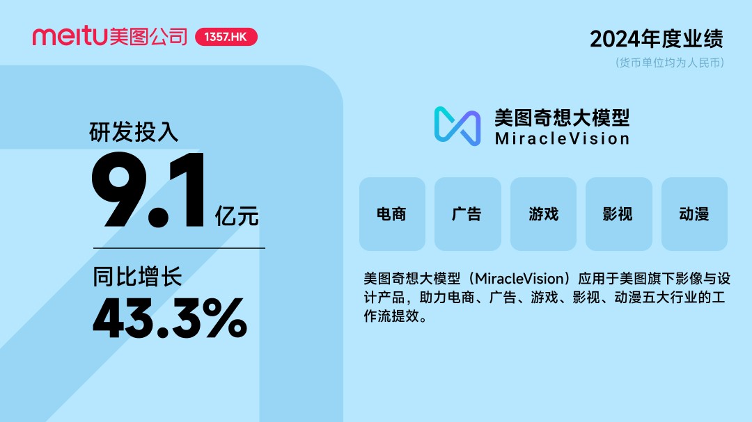 为进一步提升核心视觉领域的竞争力,美图公司2024年研发投入9.1亿元,同比增长约43.3%。