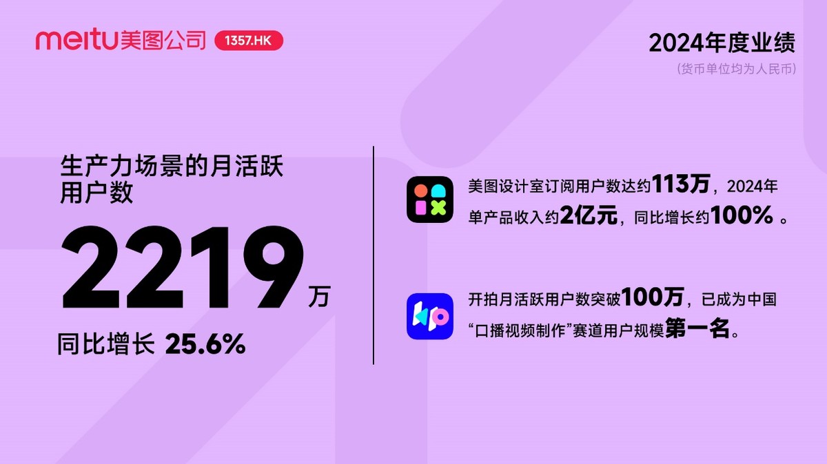 继广告、生活场景应用后,美图公司将生产力工具视为第三增长曲线。截至2024年12月31日,美图公司在生产力场景的月活跃用户数同比增长25.6%,达到2219万。这一场景主要为商业摄影、商业设计、专业视频编辑等。