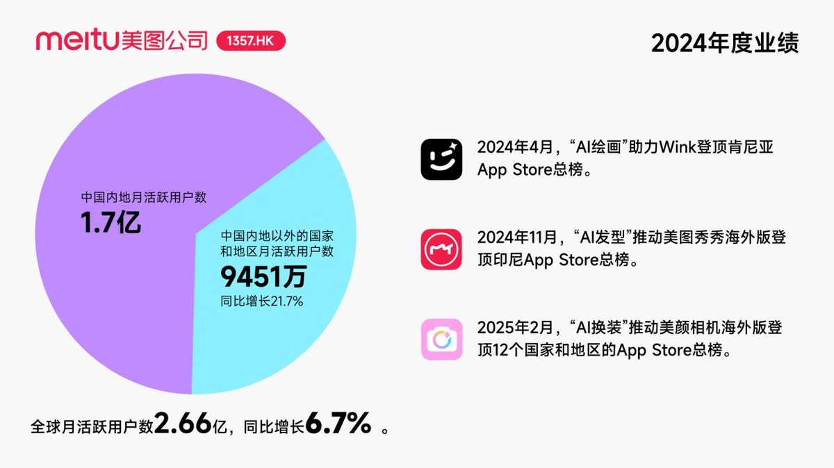 截至2024年12月31日,美图公司全球月活跃用户数达到2.66亿,同比增长约6.7%。其中,中国内地以外的国家和地区月活跃用户数为9451万,同比增长约21.7%,占整体月活跃用户数的35.6%。