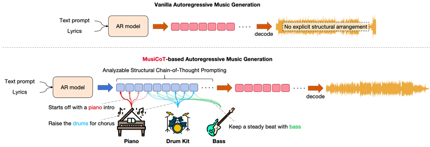 MusiCoT的核心创新在于首次将思维链(Chain-of-Thought, CoT)方法引入音乐生成领域,开创性地改变了传统自回归模型的生成范式。与传统模型逐步生成音频的方式不同,MusiCoT在细粒度音频token预测之前,率先预生成整体音乐结构框架。这一技术革新显著提升了生成音乐在结构连贯性、乐器编排精准度以及艺术表现力等方面的表现。此外,MusiCoT基于CLAP架构,实现了无需人工标注的高效扩展能力,同时大幅提升了生成音乐的可解释性与创作质量。