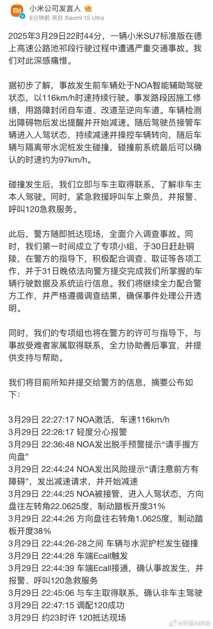 这件事情的最终定论,自然要等官方结果,再来看到底是不是小米汽车的主要责任。不过我看到,小米这次没有像有些新势力车企一样,出了事故藏着掖着甚至禁止讨论,而是在第一时间公开了法律允许公开的信息,让外界大致看到了事故的过程,这个态度是要点赞的,这确保了事件处理“公开透明”的第一步。