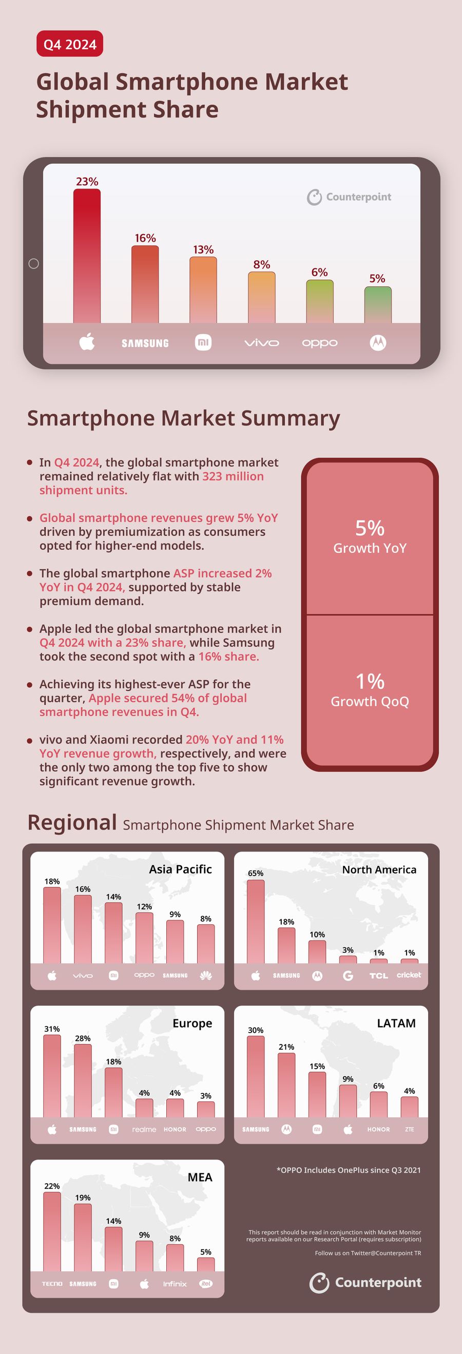 近日,CounterPoint 发布的 2024 年第四季度全球智能手机市场数据显示,当季全球智能手机出货量达 3.23 亿台,整体市场表现保持稳定。