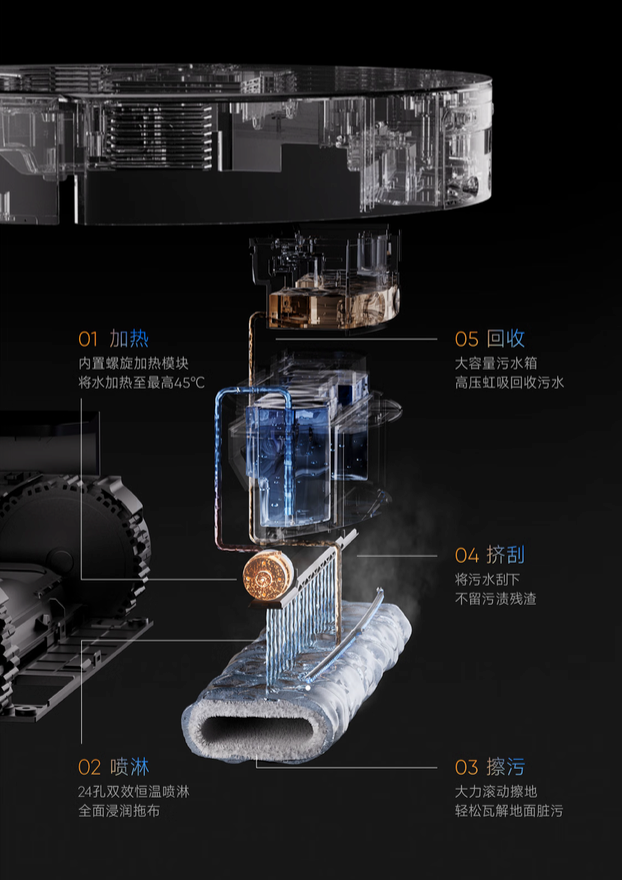 在清洁过程中,内置的螺旋加热模块可将拖布实时加热至恒定45℃,杜绝以往冷水拖地难以溶解油污的问题。同时依靠多孔位清水喷淋以及拖布履带式滚动,结合最高18N的对地压力,可以对厨房油污等顽固污渍进行彻底清洁。