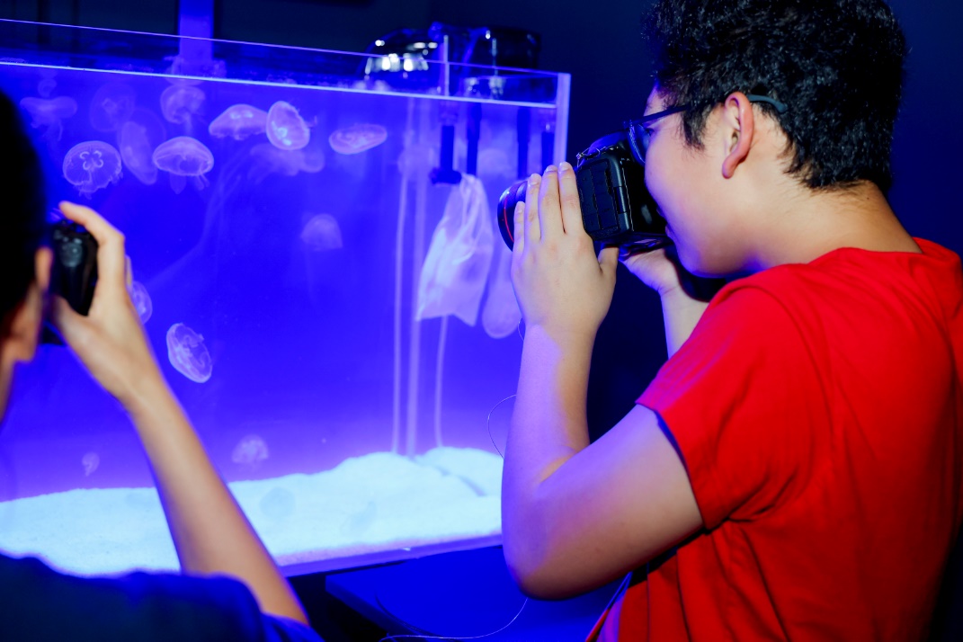 整个展览共设置三层展区。一层为影像艺术互动区,通过光影与影像的结合,为影像作品增添灵动和强烈的视觉呈现。二层是“文化遗产石窟”和“深海秘境”沉浸式观展体验区,“文化遗产石窟”的展区设计用纸艺重现了石窟场景,现场展示如唐代鎏金铁芯铜龙、商代戴金面罩青铜人头像等文物摄影作品,并通过投影的方式呈现,让参观者在虚实交错中完成一场跨越时空的文化对话;而在“深海秘境”体验区,借助光影技术,观众仿佛置身于神秘的海底世界,与水下生物进行一场亲密的对话。四层的展览内容则更加丰富,实景搭建的艺术风格花园美轮美奂,成为参观者争相打卡的梦幻背景;多面镜射的深空和沉浸式投影打造的极光海滩让人沉浸于“星穹咏叹”的视觉洗礼;更有那被大气中的尘埃粒子反散射形成的淡粉色光弧,这个反曙暮光也叫“维纳斯带",灰蓝的色带就是地球的影子。气膜材质灵感源于在观测时感受到的“天空的呼吸”,把无形的空气实体化。观众看到的不只是“固体”,也像空气在光中的显影。这标志了维纳斯带的生命性:轻盈、流动、随时间消散。球体仿佛在呼吸,回应着人类与大气之间最基本的连接,为到场的每一位观众献上一场真实可感的天文奇景。