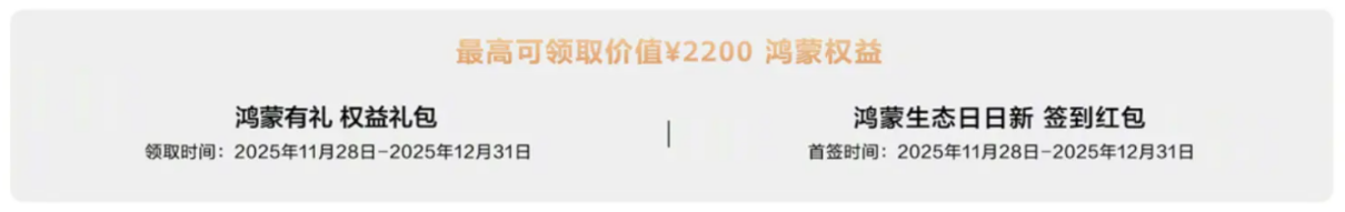 不仅如此,新机到手后,用户还可领取1200元鸿蒙有礼权益,至高1000元鸿蒙日日新签到红包,叠加以旧换新额外补贴300元,满打满算相当于优惠2500。此外,还可以享12期分期免息,叠加国补之后还能再省500,极大地降低了消费者的入手门槛。