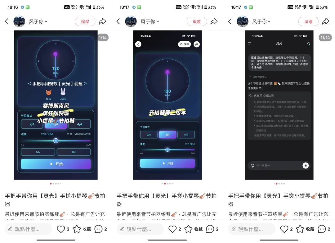 社交平台也进一步放大了这种创造热潮。在小红书等平台上,#全民手搓 AI 闪应用#的话题下,大家纷纷分享自己用灵光手搓的应用,而每一个「灵光一闪」,都像一个个被搓出来的生活补丁,填补了那些琐碎但重要的日常需求。