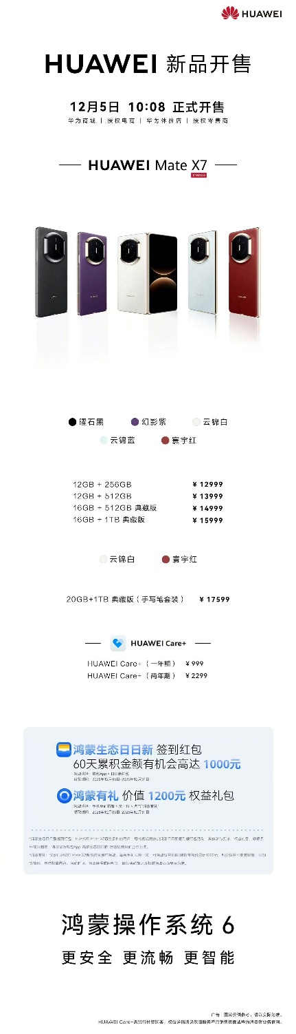 目前,这款致力于夯实折叠屏体验标杆地位的旗舰机型已经于12月5日10:08全面开售,售价12999元起。选择华为Mate X7,不仅是选择一部手机,更是选择一种高效、精彩且安心的全新生活方式。现在购机的用户,不仅能率先体验鸿蒙生态“日日新”的活力,更能参与鸿蒙生态专属活动,领取价值1200元的权益和累积最高1000元的60天签到红包。
