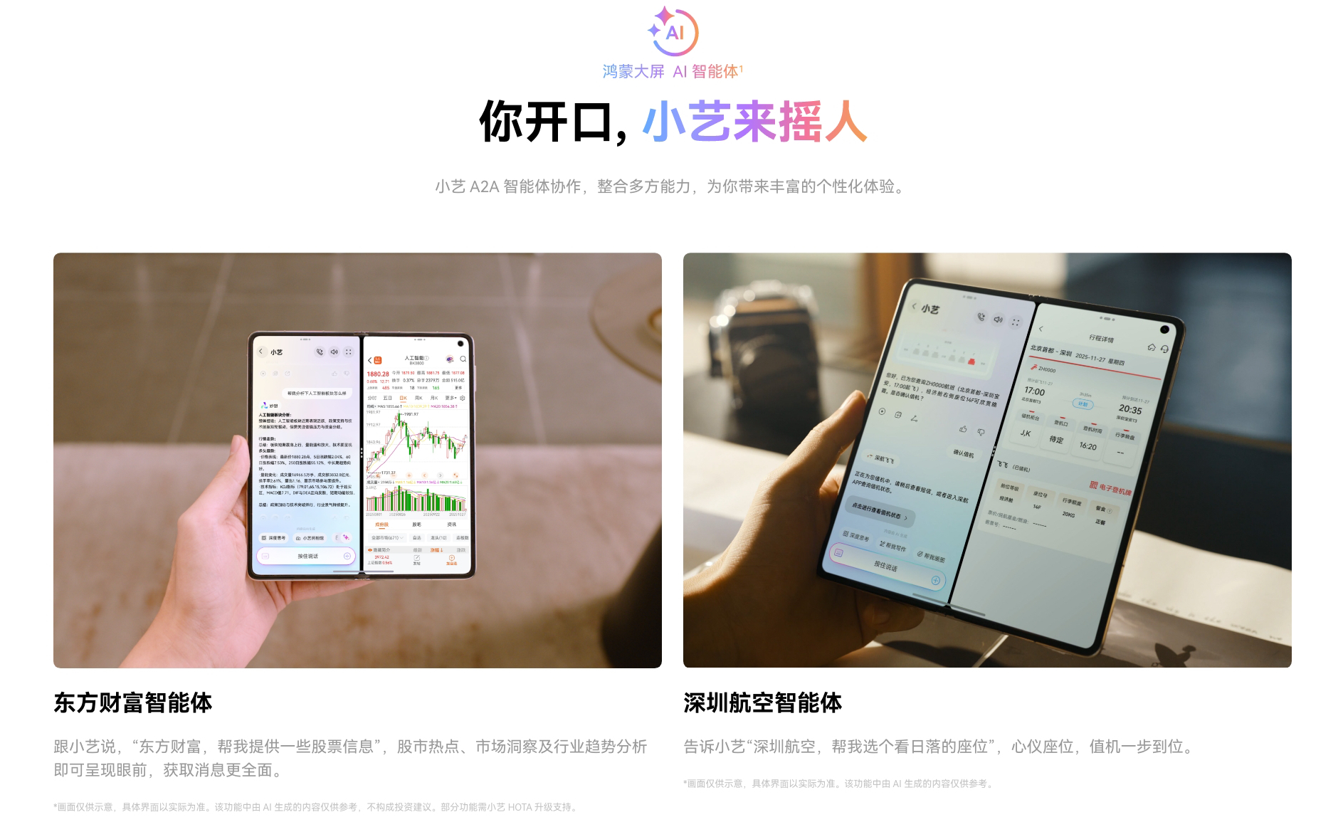 这意味着,小艺和TA的伙伴们,能够真正理解用户的复杂意图并进行服务。当用户需要快速做出投资决策时,只需说“东方财富,帮我提供一些股票信息”,相关的股市热点、市场洞察及行业趋势分析便会分屏呈现。在出差途中,告诉小艺“深圳航空,帮我选个看日落的座位”,值机与心仪座位的选择便能一步到位。如果想利用碎片时间充电,一句“喜马拉雅,帮我推荐自我提升的播客”,系统便会根据用户的喜好,匹配个性化的播客清单。