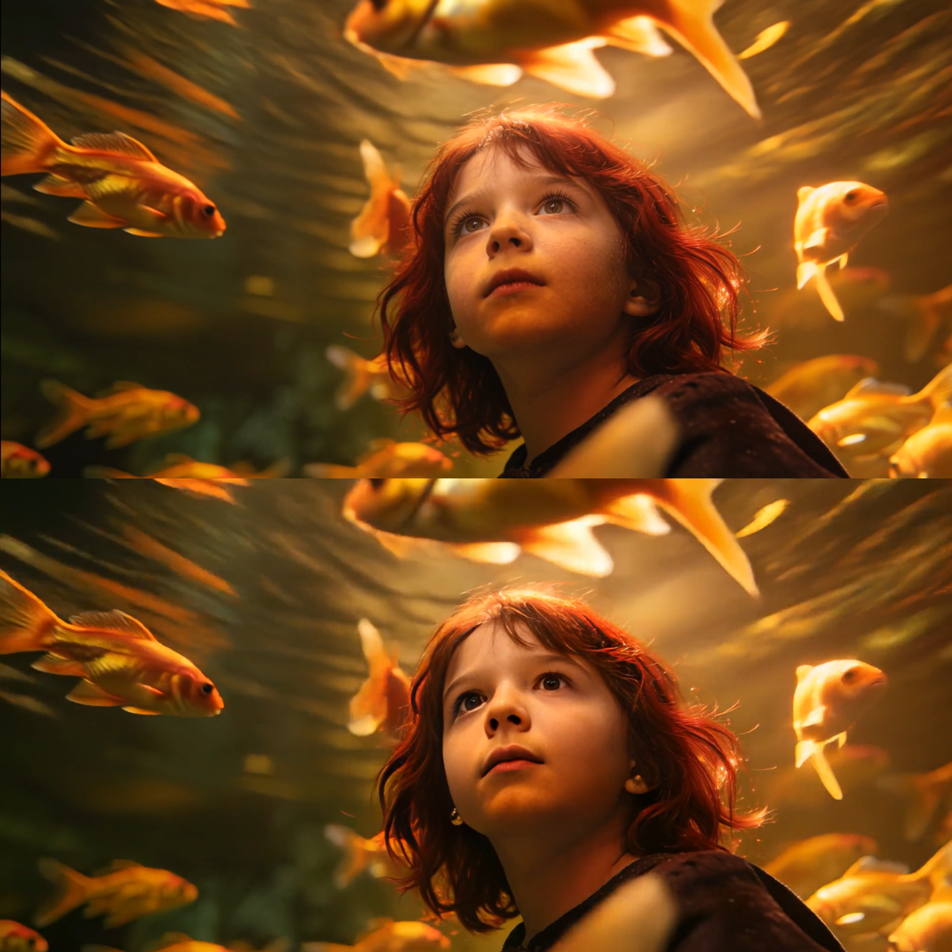 在本次测试中,为续写段落设定了明确的创作提示词:“画面保持女孩主体的大小与位置不变,镜头快速向前推进,形成类似希区柯克变焦的视觉效果,同时整体色调由暖金色逐步过渡至深蓝色,以营造更为深邃、幽暗的情绪氛围。”这类设定本身涉及镜头运动控制、主体稳定性与情绪转场的协同处理,通常需要较高的剪辑与调色经验。生成结果显示,AI在主体稳定性、镜头运动方向以及色彩过渡上均保持了良好的一致性。画面推进具有清晰的视觉指向,色调变化自然连贯,情绪从温暖逐步下沉,完成了一次具有明确情绪转折的画面延展——画面开始真正具备叙事能力。