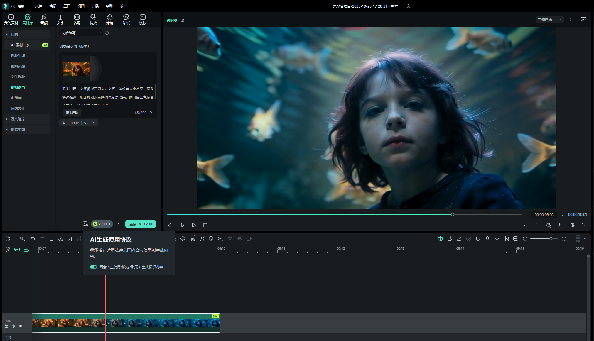在图生视频生成的基础上,此次评测进一步体验了万兴喵影2026全新推出的AI续写功能。该功能常用于解决素材时长不足与画面衔接的问题,而在实际使用中,AI续写也能参与到画面延展与叙事构建中,为视频提供更完整的表达空间。