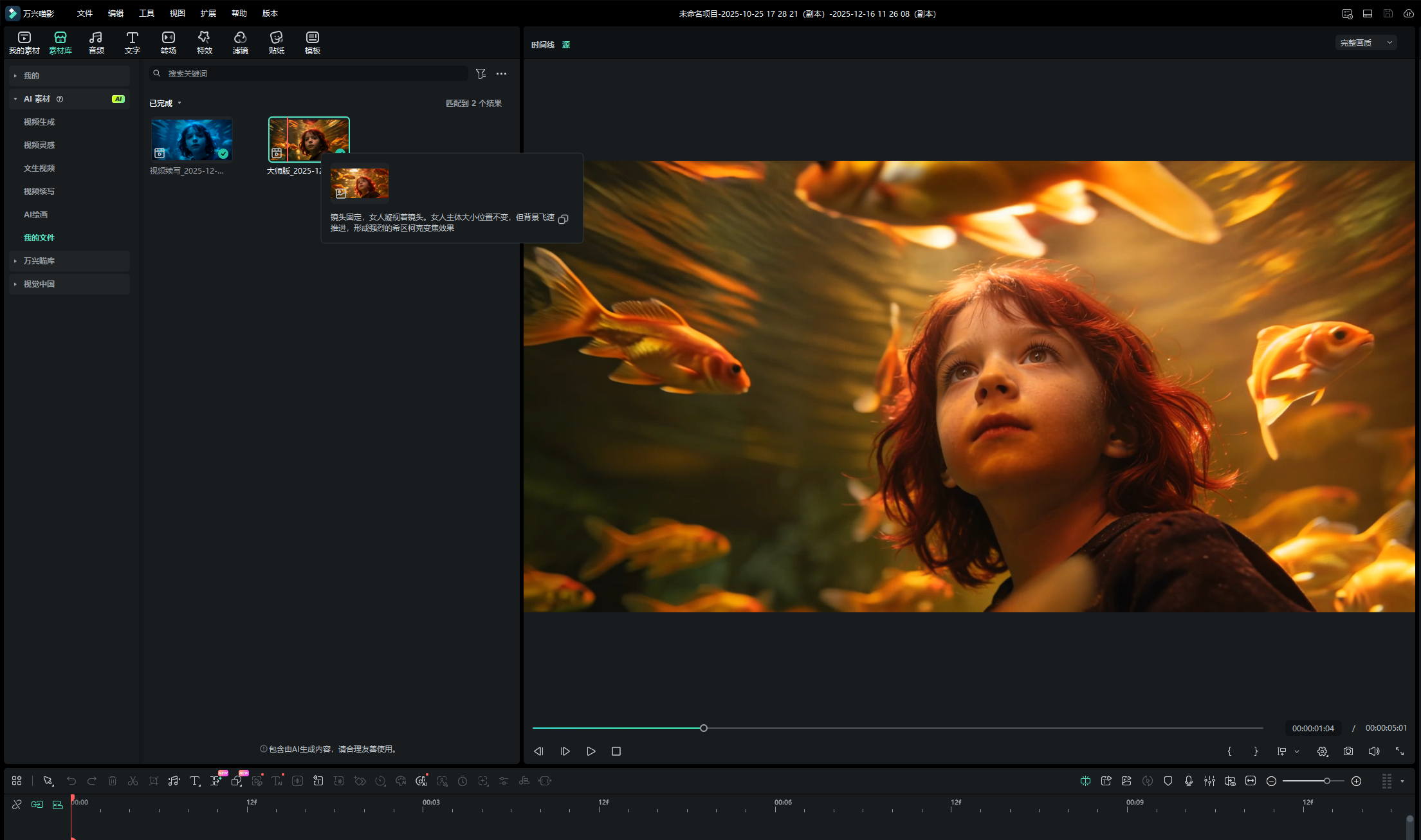 在成片阶段,此次测评进一步引入AI音乐与AI超清功能,对画面的情绪节奏与整体质感进行完善。在音乐部分,选择了偏梦幻、悲伤的氛围向风格,且设定以钢琴与环境音效为主,整体节奏相对克制。从实际效果来看,生成的音乐在节奏与情绪走向上与画面保持了较高匹配度,使原本以视觉为主的片段,获得了更清晰的情绪推进,也完成了从画面呈现向叙事表达的过渡。