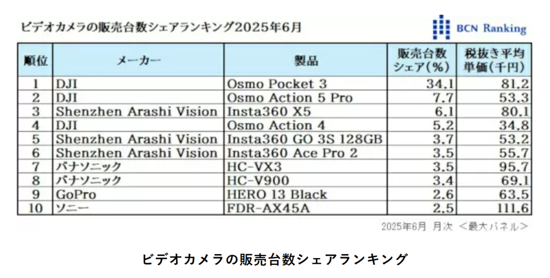 先来看一组数据,自2023年10月上市以来,DJI Osmo Pocket 3的销售表现堪称行业现象。据日本权威零售分析机构BCN+R数据显示,日本市场每售出三台摄像机,就有一台以上是Osmo Pocket 3。其市场份额在2025年6月创下34.1%的历史峰值,且自上市首月后从未低于20%。