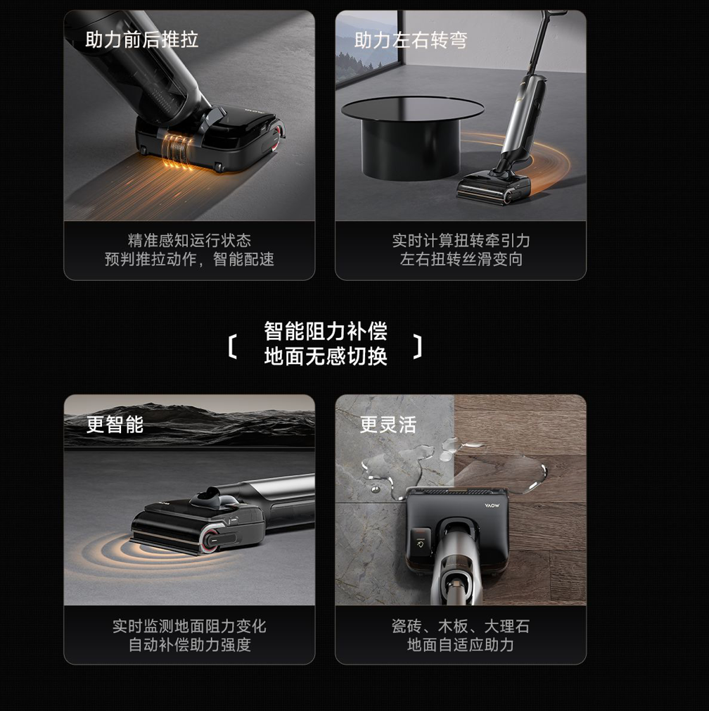 在这方面M50 Ultra 做了两个方向的优化:首先是结构上把抓柄位置和重量分布做得更均衡;其次在体验上用“AI 智动轮”去判断推拉方向与地面材质,主动提供电助力,让推拉和转向更轻松。
