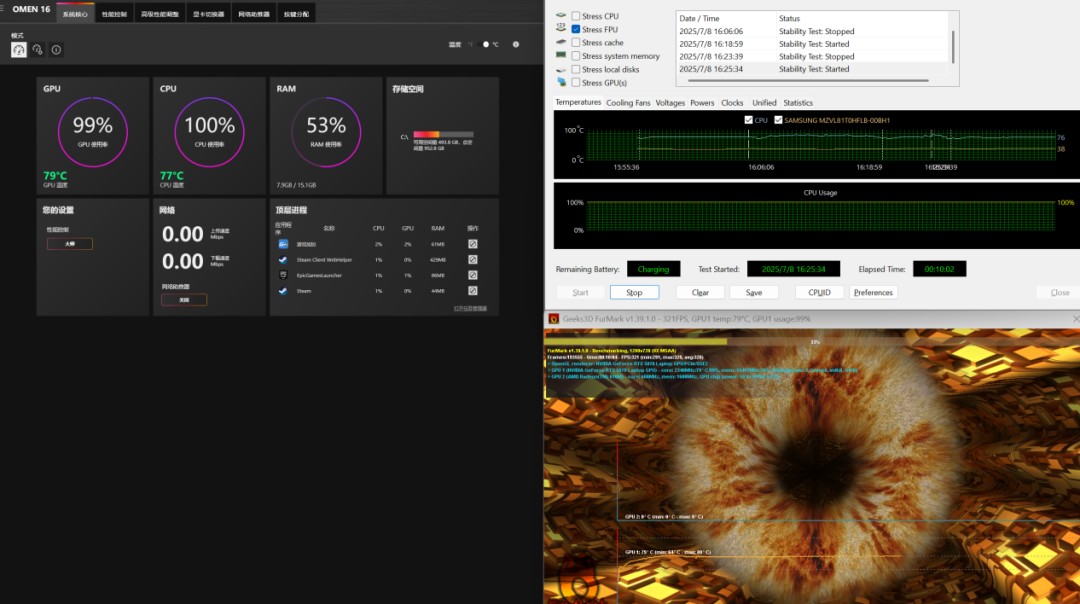 而且,暗影精灵还提供了智能设置,你不需要懂什么BIOS,不需要懂电压曲线,只需要动动鼠标,就能直接把电脑的性能拉满。而且,小雷之前做过测试,即使是满载超频状态,散热噪音和压力都没有明显提升,所以你可以放心大胆地开着狂暴模式打游戏。