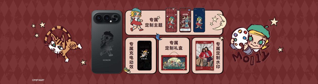 在此趋势下,荣耀与泡泡玛特联名,在MOLLY IP诞生20周年之际,推出了荣耀500 Pro MOLLY 20周年限定版。荣耀此次基于MOLLY 经典“小画家”形象进行产品层面的深度定制,致力于打造一款具有收藏价值的“科技潮品”,为用户提供兼具实用功能与情感归属的珍品。