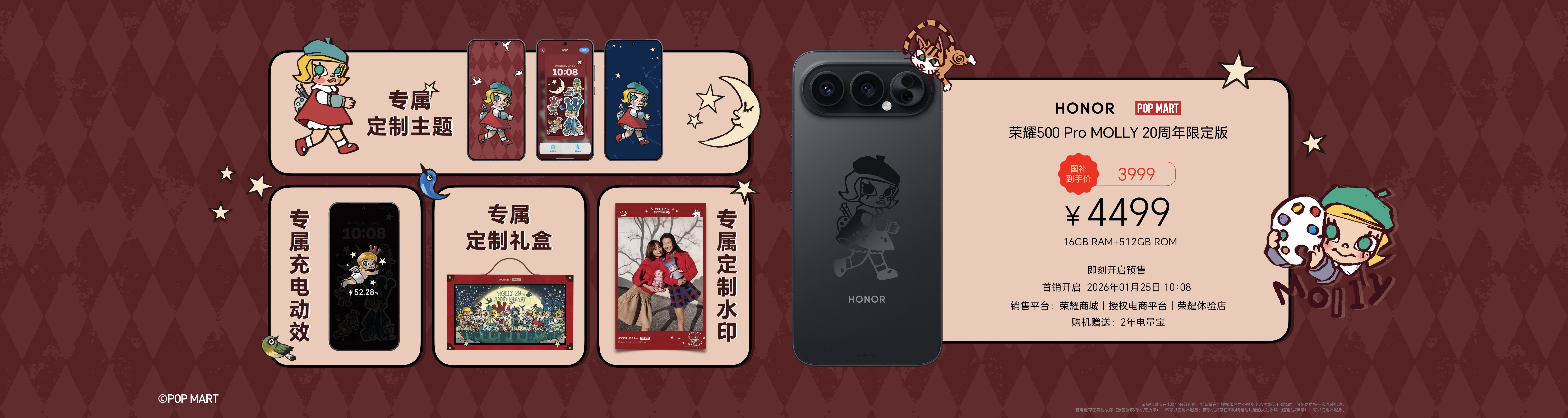 荣耀500 Pro MOLLY 20周年限定版,正是这样一份来自两位“长期主义者”的共同答卷。在2026年,我们需要的不仅是一件科技产品,更是如MOLLY般能伴随情感成长的伙伴。正值新年换机、送礼之际,这份极具收藏价值的20周年礼物,非常值得入手,售价4499元、国补后售价3999元也诚意十足。