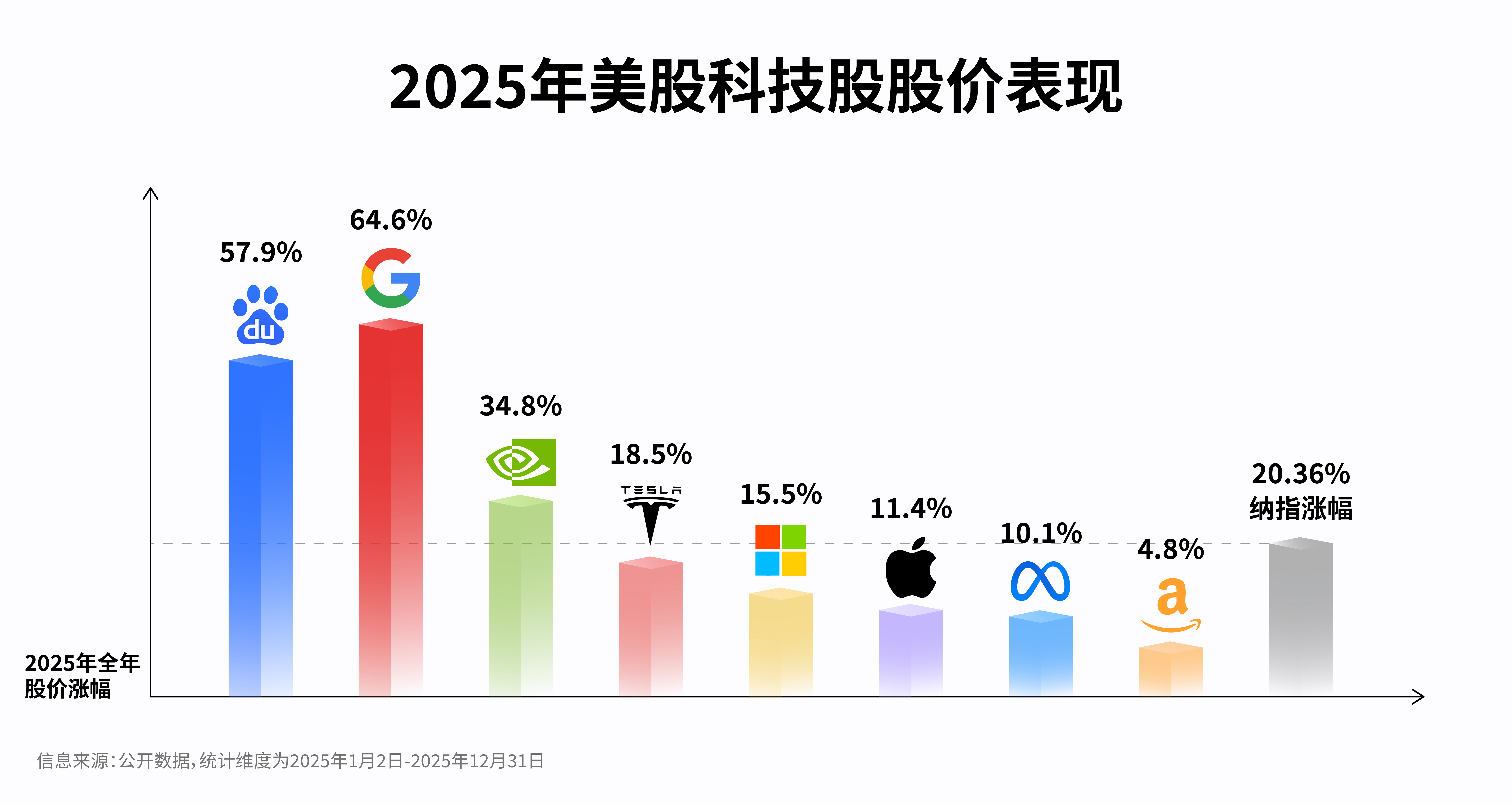 这一年,百度反而给人一种闷声不响的感觉。百度AI掉队了吗?每个人可能会给出不同的答案。但盘点2025年中概股的股价表现,我却发现了一则反直觉的事实:最低调的百度,2025年股价却涨了59%(美股),涨幅位居全球科技公司前列。