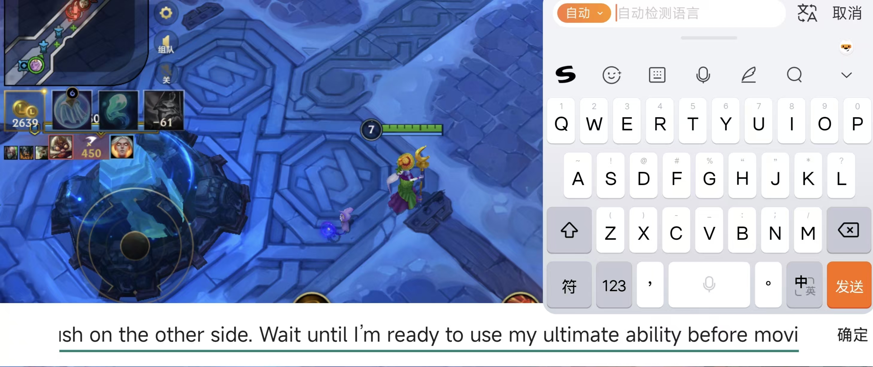 很快呀,嗖的一下,搜狗输入法就同步翻译好了,“Don’t rush, the enemy is setting up an ambush on the other side. Wait until I'm ready to use my ultimate ability before moving forward.”