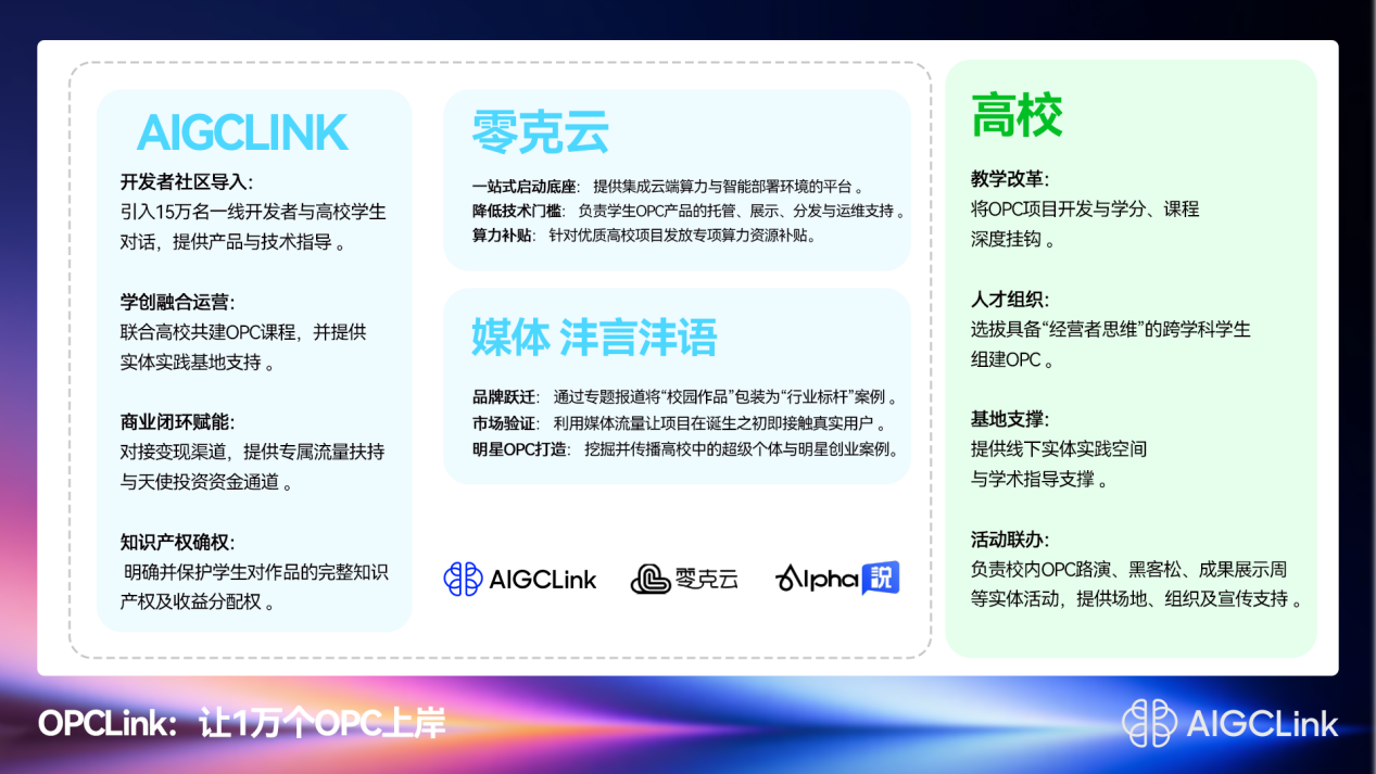 AI托管平台是OPC诞生的土壤。在技术层面联合零克云提供了关键的“一站式”启动底座,集成了云端算力与智能部署环境,极大降低了学生OPC产品托管、展示、分发与运维门槛,让学生能将精力百分百聚焦于商业创意本身。同时,打通了从创意到变现的“最后一公里”,通过AIGCLINK专属流量扶持、Alpha说媒体曝光等,确保每一个学生OPC项目在诞生之初就能直面真实用户,完成最宝贵的早期市场验证,让创意迅速接受商业洗礼。